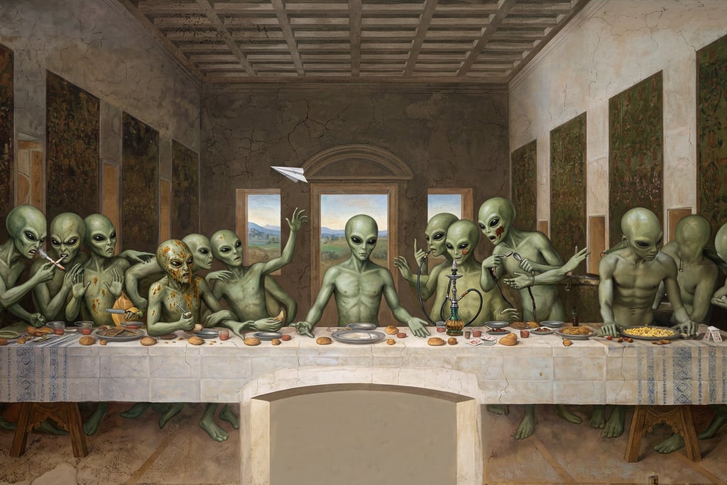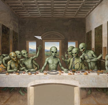 Wie bin ich nur zu dieser Idee gekommen? Ursprünglich machte ich mir Gedanken um ein mal etwas anderes Mannschaftsfoto für einen Fußballverein und kam dann schnell zu diesem Chaos-Motiv. Leonardo Davinci's Abendmahl einmal anders. Nun, da es jetzt KI gibt, ist die Mannschaft überflüssig und ich hab noch einen draufgesetzt.