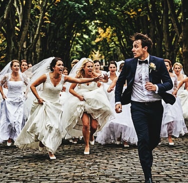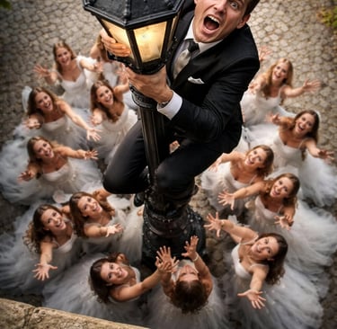 Als ein lokales Brautmodengeschäft wegen Ruhestand seine Tore schloss, konnte ich im Ausverkauf etliche Brautkleider zum Schnäppchenpreis ergattern. Ich hatte zwar keinen konkreten Plan, aber manchmal muss man Angebote einfach wahrnehmen. Nun saß ich da mit mindestens zehn Kleidern und bald entwickelten sich mehrere Bildideen. Viele Anbieter aus der Hochzeitsbranche hätten daraus werbetechnisch einen Nutzen ziehen können – ich sage nur: Guerilla-Werbung oder Fototapete im Verkaufsraum. Leider gab es dazu nie Gelegenheit und aus eigener Tasche wäre das Projekt kaum finanzierbar gewesen. Dennoch, wieder zu 99 % meiner Vorstellung entsprechend, hier zwei KI-Ergebnisse zum Thema Wedding: